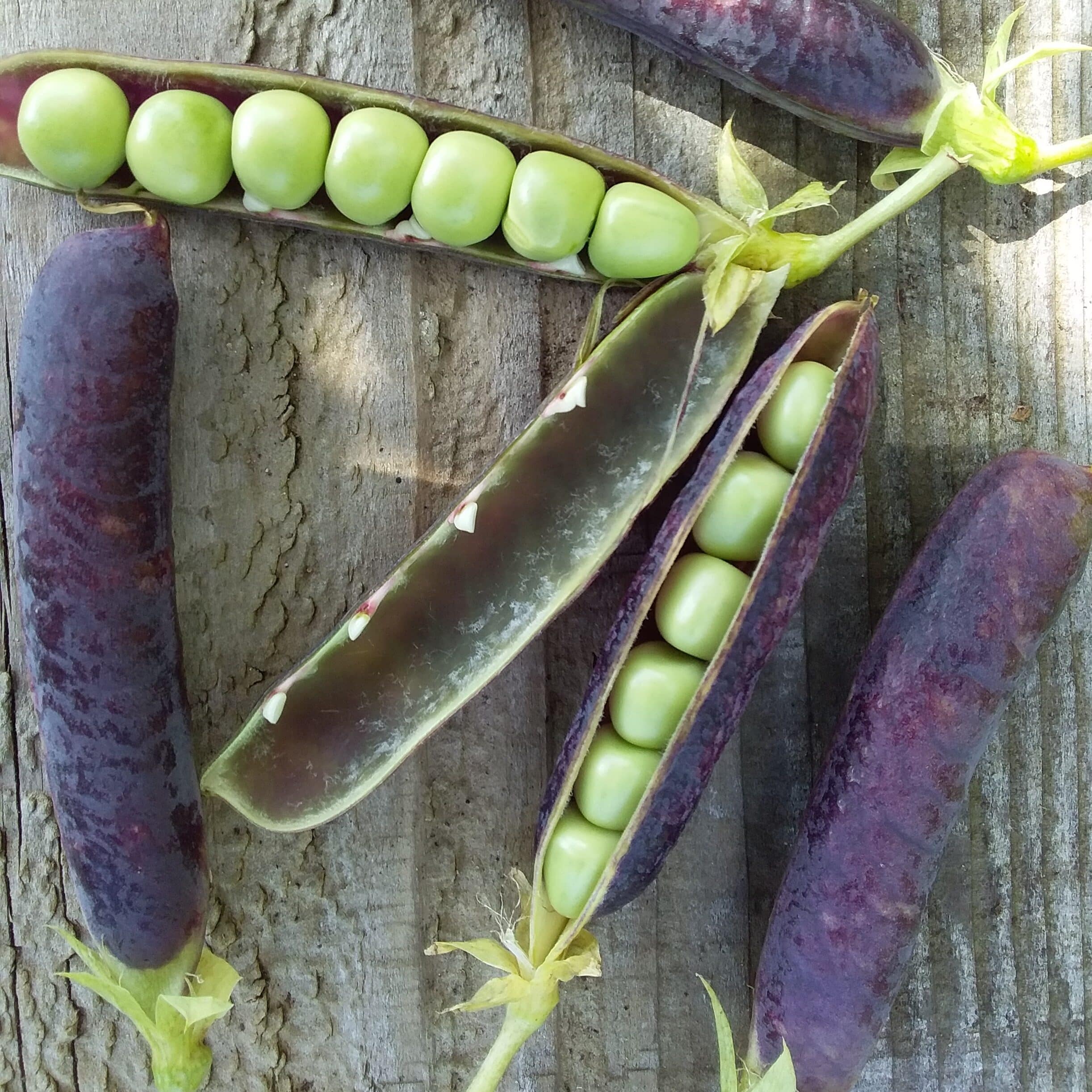 Les plantes font 1 mètre de hauteur. C’est un pois gourmand dit beurre. Les fleurs sont violettes et les vrilles sont très développées. Les gousses sont entièrement violettes ou bien marbrées de violet.